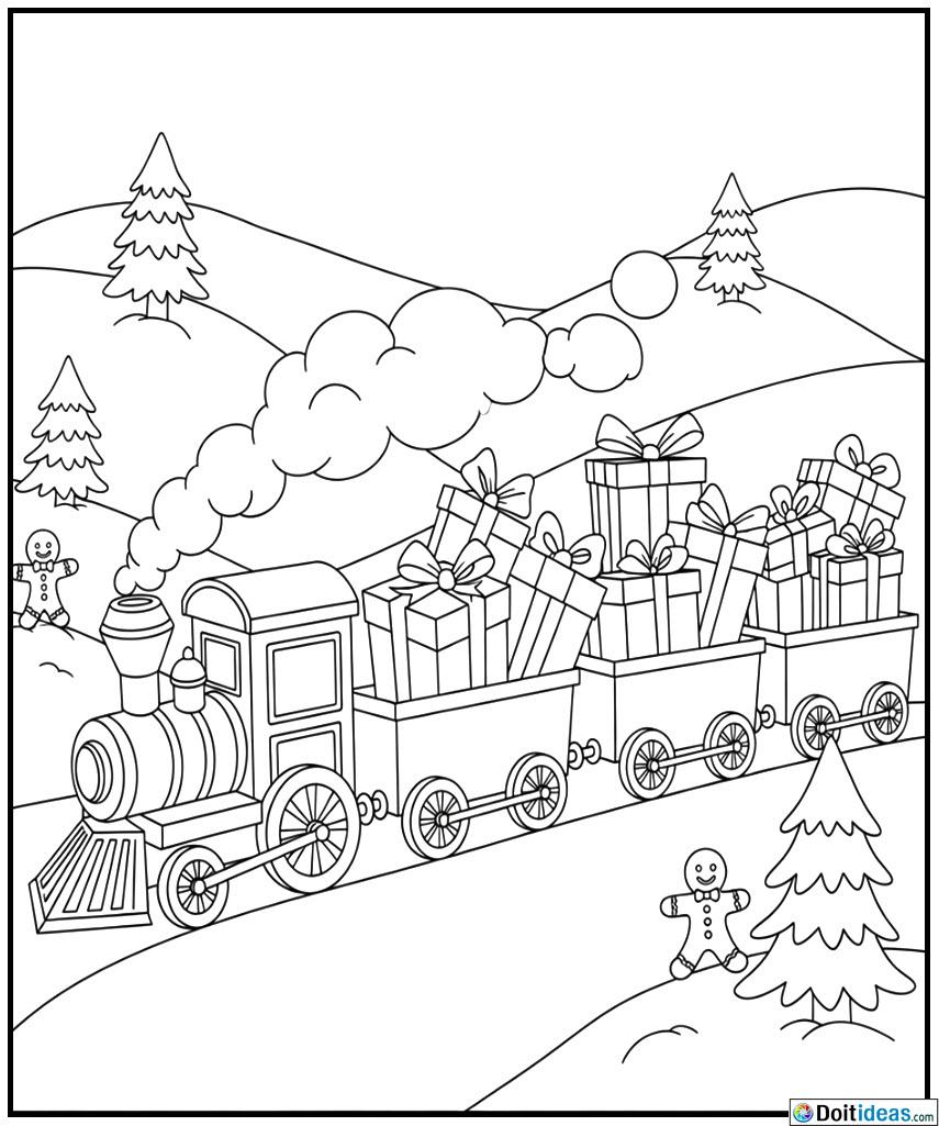 It is a Christmas train colouring page with gifts which display a jolly locomotive full of presents in stacks of wrappers. The drawing is of a traditional train engine with a festal touch of garlands, bows, candy crawls and even a small Christmas tree inside one of the cars. Gift boxes are spilling all over the waggons and a playful exuberant seasonal picture is created. The train can be surrounded by snowflakes,... show all