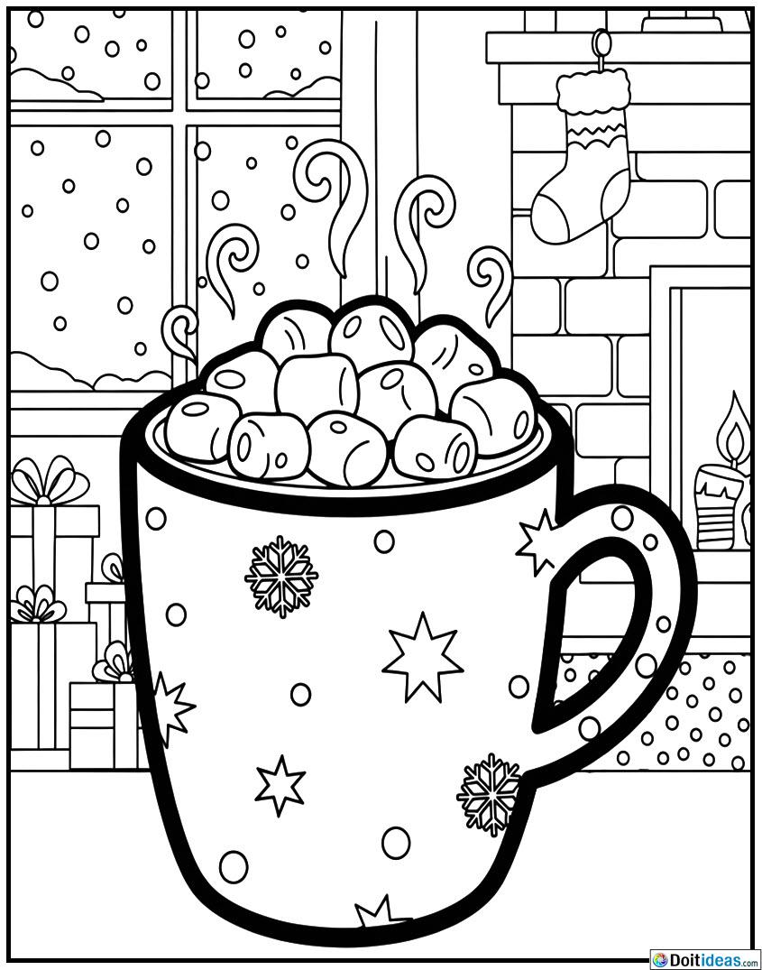 The hot cocoa mug with marshmallows is just but a coloring page which surrounds the season with the warm-up feeling and spiciness of the holiday season. The image is of a hot mug of delicious hot cocoa with fluffy marshmallow topping, whipped cream or even candy cane stirrer. The mug may be surrounded with seasonal decorations (holly, snowflakes, stars, or a festal table set-up) and this will help to promote the... show all
