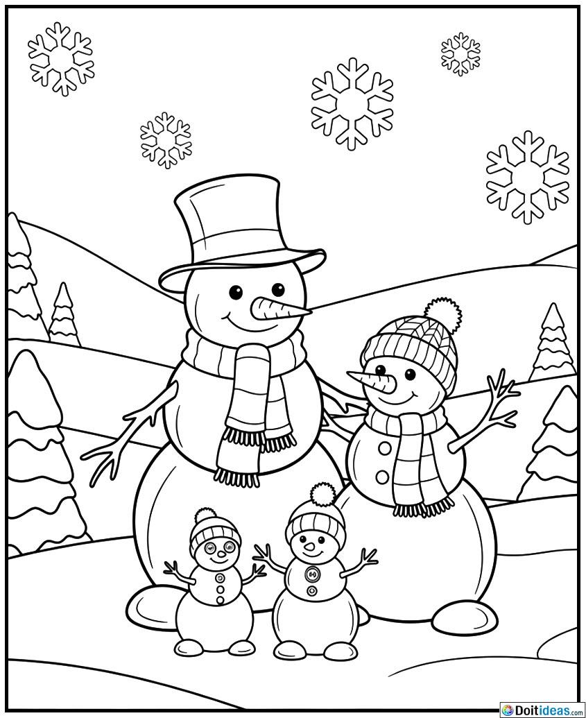 This snow family on winter scene color page is full of the naughtiness of a snowy holiday day. The image depicts a family of snowmen, one including snowmen with scarves and hats and mittens and the other snowmen depicted as child, and is surrounded by a winter scene of snow on the trees, soft hills and falling snow. The scene is interesting and entertaining to the kids to complete because of the playful faces and... show all