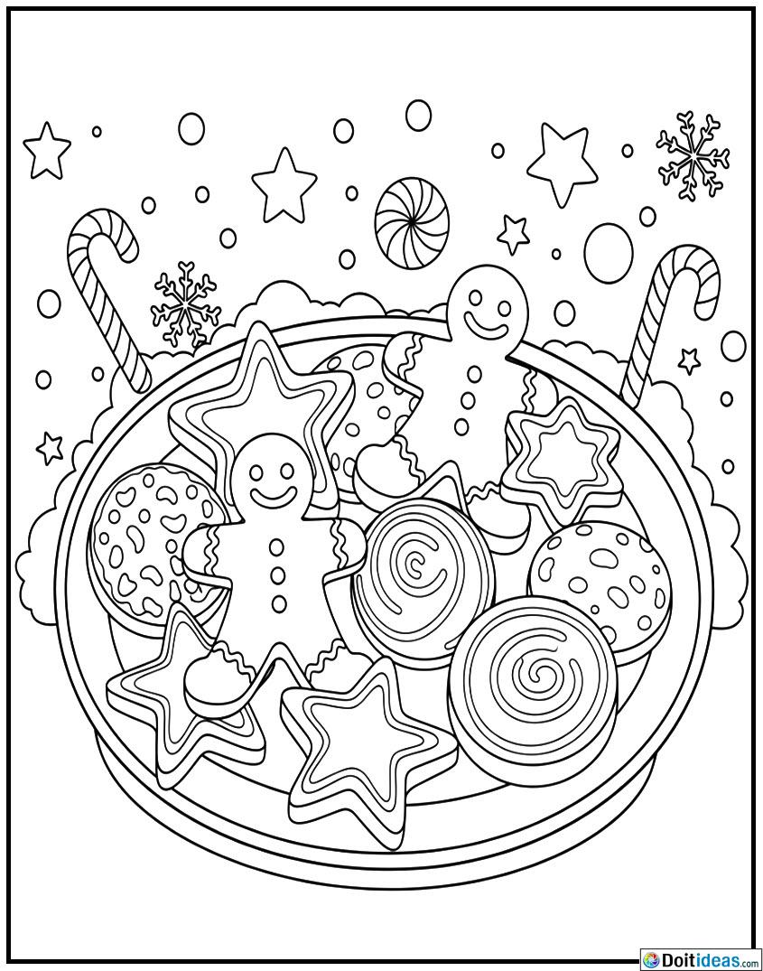 The layered colour plate cookies page the colour alters concentration on the mouth-watering qualities of baking during the holidays. The drawing has a feast plate with beautifully adorned cookies, including gingerbread figures, stars, candy canes, snowflakes and shapes of trees. Ice decorations, sprinkles and patterns of decorations make the picture more interesting and give the impression of a home-made warm... show all