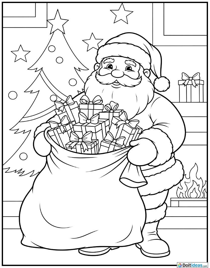 This Santa with a sack of gifts page is how the magic and the generosity of Christmas are captured. The drawing depicts the happy Santa Claus holding a big and overflowing sack of gifts that he is about to deliver to spread the holiday spirit. The traditional red suit, the big white beard, and a smiling face of the old gentleman add warmth and celebration to the picture. The situations around the main subject can... show all