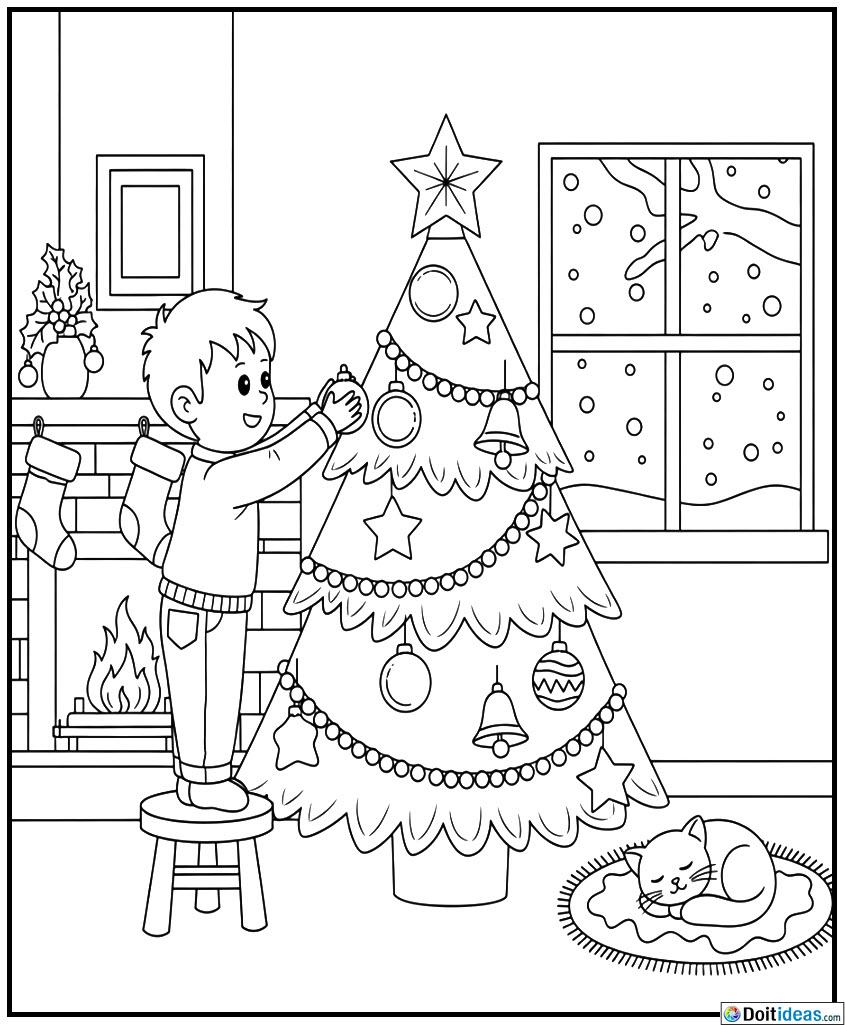 The magic and the thrill of Christmas tradition are preserved in this child colouring page on the Christmas tree. In the drawing, one will see a smiling child adorning ornaments on a well deformed evergreen tree, with presents wrapped and festivals setting around it. The tree could have baubles, candy canes, ribbons and a shining star on the top and the background could be snow softly falling softly or inside... show all
