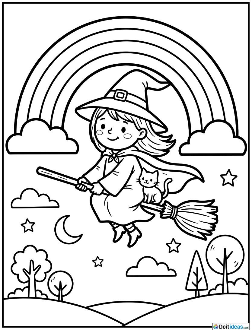 In this cute coloring sheet, one sees a little witch flying happily over the sky on her broomstick under a shine in the rainbow. It is a fun and fantasy-filled scene that is quite appropriate to young children. The witch has a typical point hat and a trailing cape as she goes flying around the air and the rainbow is painted beautifully making arch above her. The page was greatly illustrated in black and white line... show all
