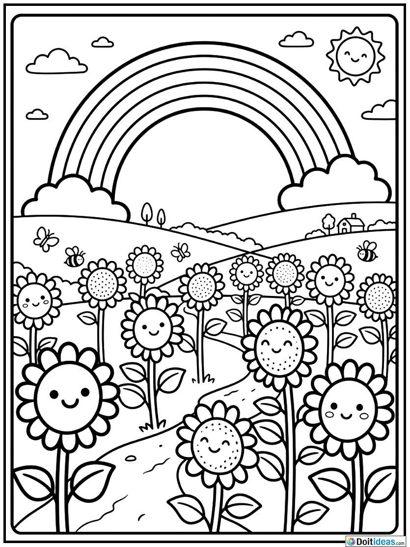 It is a colorful page, with a smiling rainbow and a large sunflower with a great foreground forming a sunny happy picture. Its drawing is structured in thick lines and plain black and white line drawing, so that children find it very simple and entertaining to color it. Large sunflowers having massive centers move across the paper, and the petals provide enough room to be colored creatively. Rainbow introduces a... show all