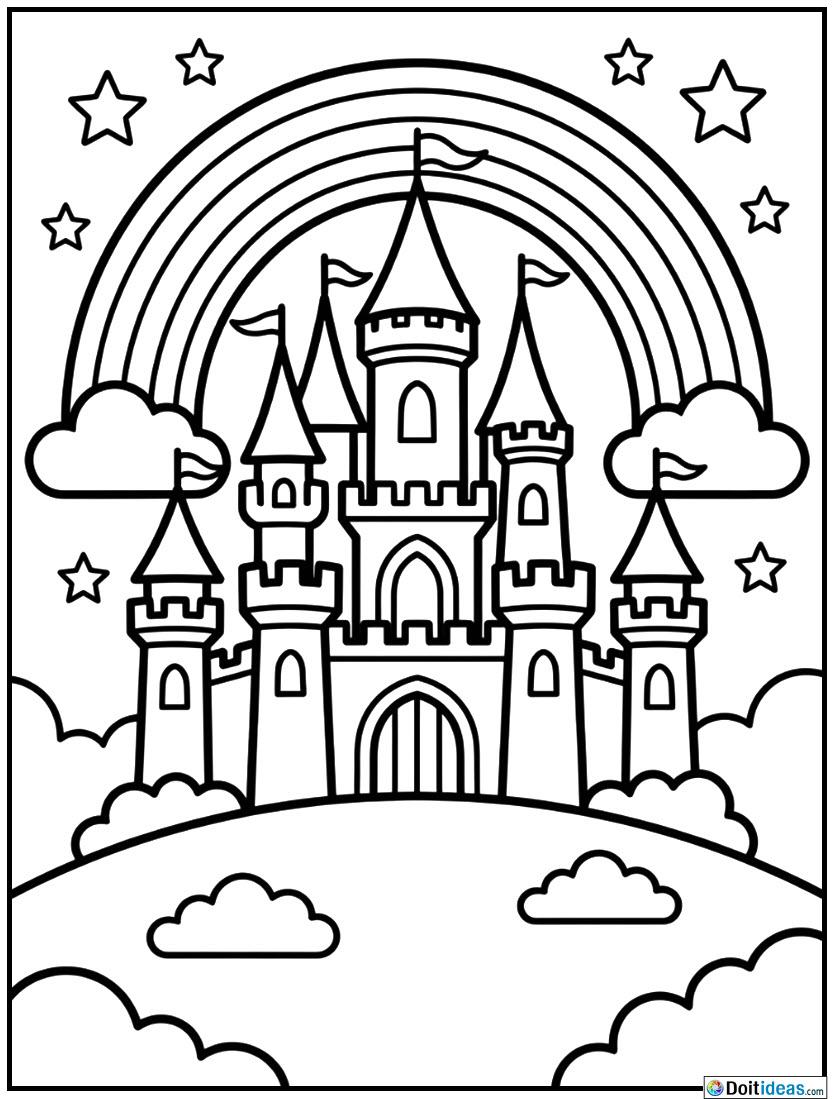 The drawing is made in very thick outlines and simple figures, which makes it ideal to children and amateurs of the colorist. High towers of the castle, small windows, and ornaments of flags contribute to a need to imagine and makes it look like a fairy-tale. A rainbow presented in the middle of the sky helps to provide the picture with a gloomy and fairytale atmosphere, and the picturesqu steps of the hill make... show all
