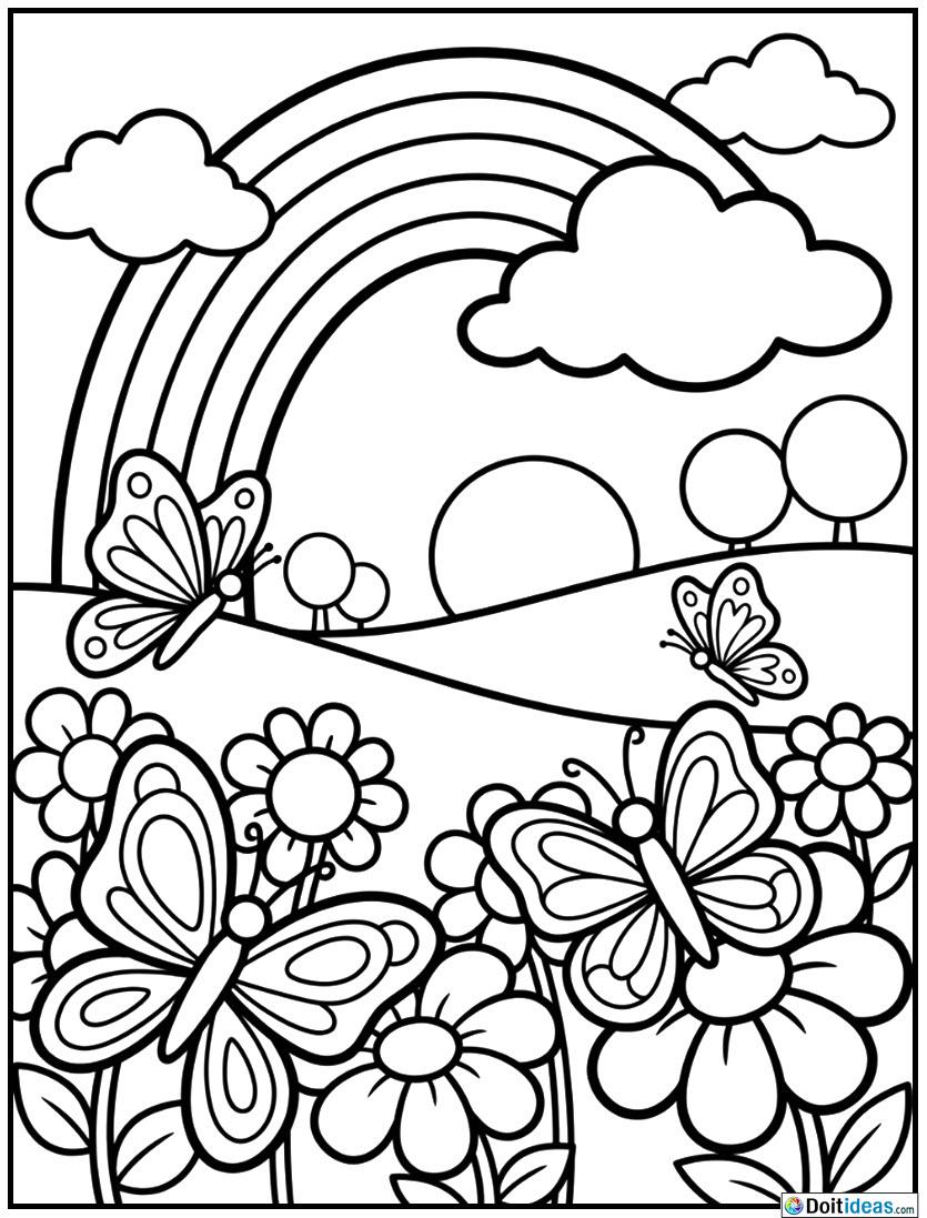 The splendid coloring page consists of a gorgeous rainbow that extends over the sky resting on a magical garden with huge flowers and butterflies fluttering around it. Its design consists of oversized outlines and plain black and white line art and therefore easy and enjoyable to color in by kids. The bloated flowers present a fantasy garden of cuteness, and a fantasy garden whereby the butterflies dance around... show all