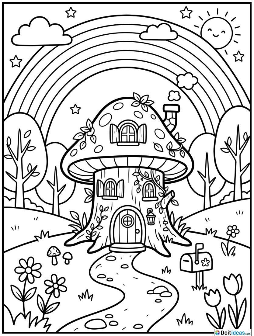 This lovely coloring page comprises of a cute little fairy house standing in a fantastic scenery with a bright-colored sky of rainbow. The drawing has thick lines and plain line drawing with black and white lines and therefore, it is not hard and enjoyable to kids to color the picture. The fairy house is also in a playful shape with small windows and a pointed roof making it beckon the kid to have their... show all
